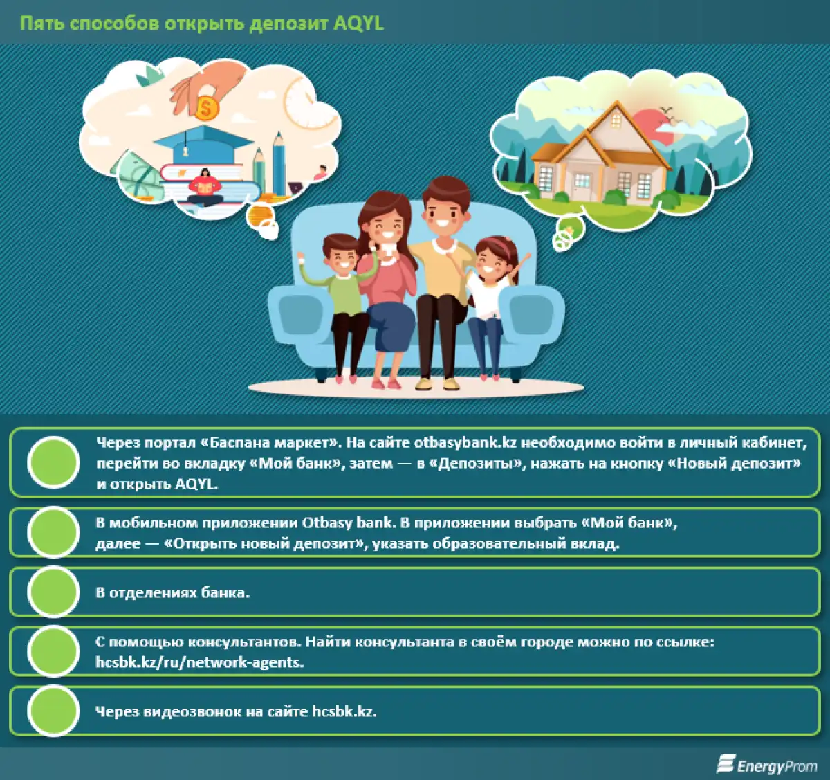 Ниже в инфографике приведена для примера инструкция, как открыть депозит AQYL на ребёнка в Отбасы банке. Приводим в пример именно этот фининститут, так как если ребёнок получит образовательный грант, накопления, сделанные по программе «Келешек», можно будет направить на улучшение жилищных условий. В этом случае вся сумма, накопленная на счёте, включая вознаграждение банка, премии государства и стартовый капитал, может перейти на жилищный депозит в Отбасы банке и стать первым шагом к собственному жилью.