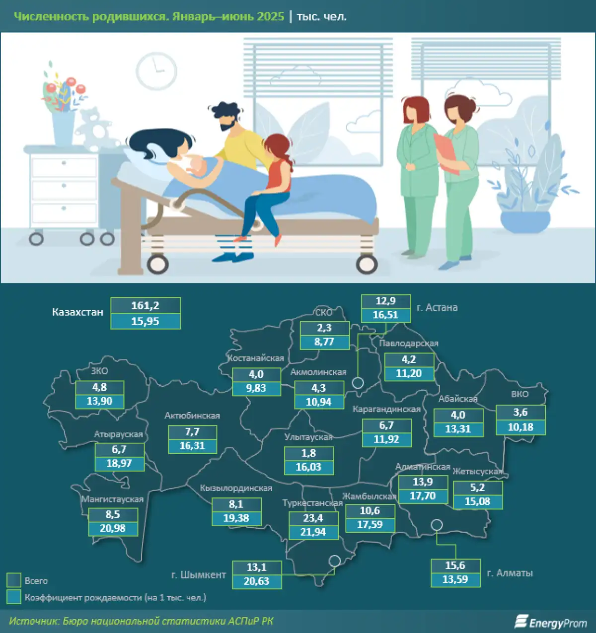 Численность населения Казахстана уже превышает 20,4 млн человек. За первое полугодие 2025-го в стране родились 161,2 тыс. малышей. Наибольшая численность родившихся традиционно пришлась на Туркестанскую область (23,4 тыс. человек), Алматы (15,6 тыс. человек), Алматинскую область (13,9 тыс. человек), Шымкент (13,1 тыс. человек) и Астану (12,9 тыс. человек).