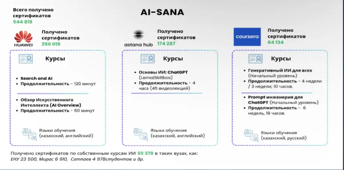 Программа охватывает массовое обучение, повышение квалификации преподавателей и внедрение интеллектуальных решений в вузах. На первом этапе 544 студента прошли обучение на платформах Huawei, Coursera, Astana Hub, получив международные сертификаты. Уже 95 университетов включили курсы по ИИ в учебные планы, а 30 вузов реализуют 38 специализированных программ.