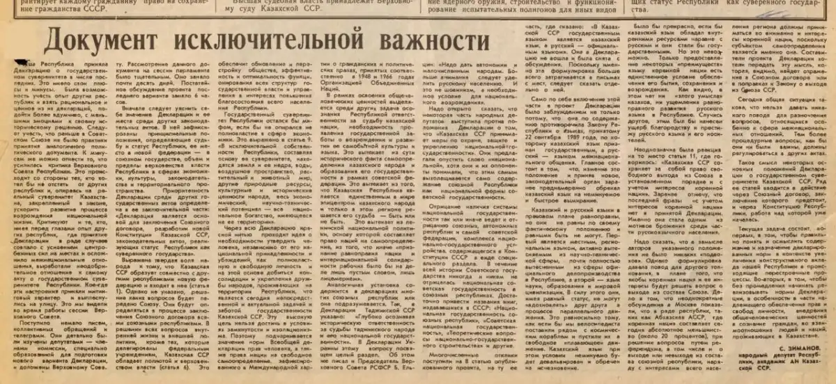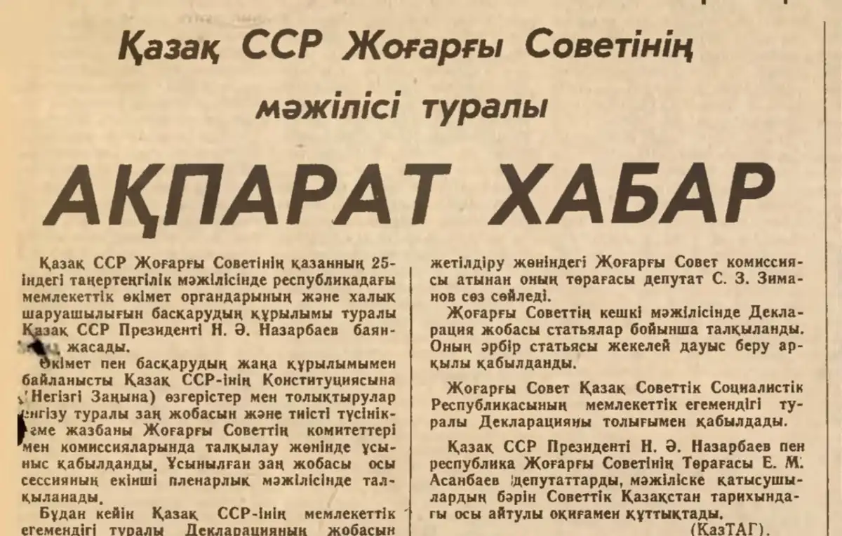 На первой полосе была опубликована речь Президента Казахской ССР Нурсултана Назарбаева о реформе государственной власти, а также сообщалось, что каждая статья Декларации принималась поимённым голосованием.