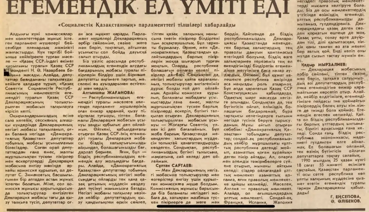 Корреспонденты парламента Г. Еңсепова и А. Әлибеков в материале «Егемендік ел үміті еді» («Суверенитет — надежда народа») передали живые мнения депутатов: