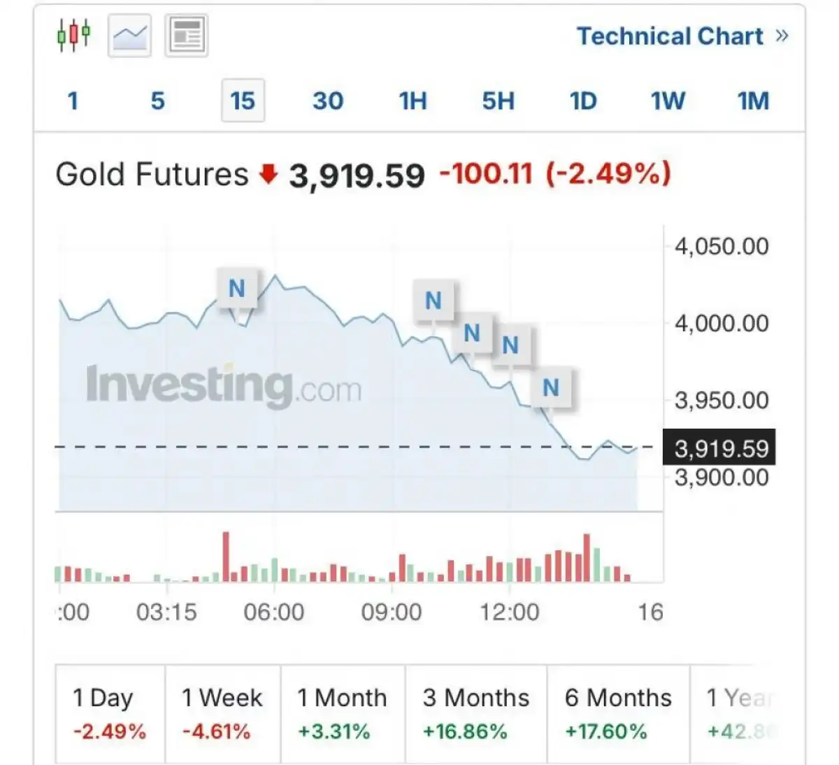 Для сравнения, 15 октября цена фьючерсов поднималась до 4 223,36 доллара, показывая рост 13,4% за месяц и 30% за последние шесть месяцев.