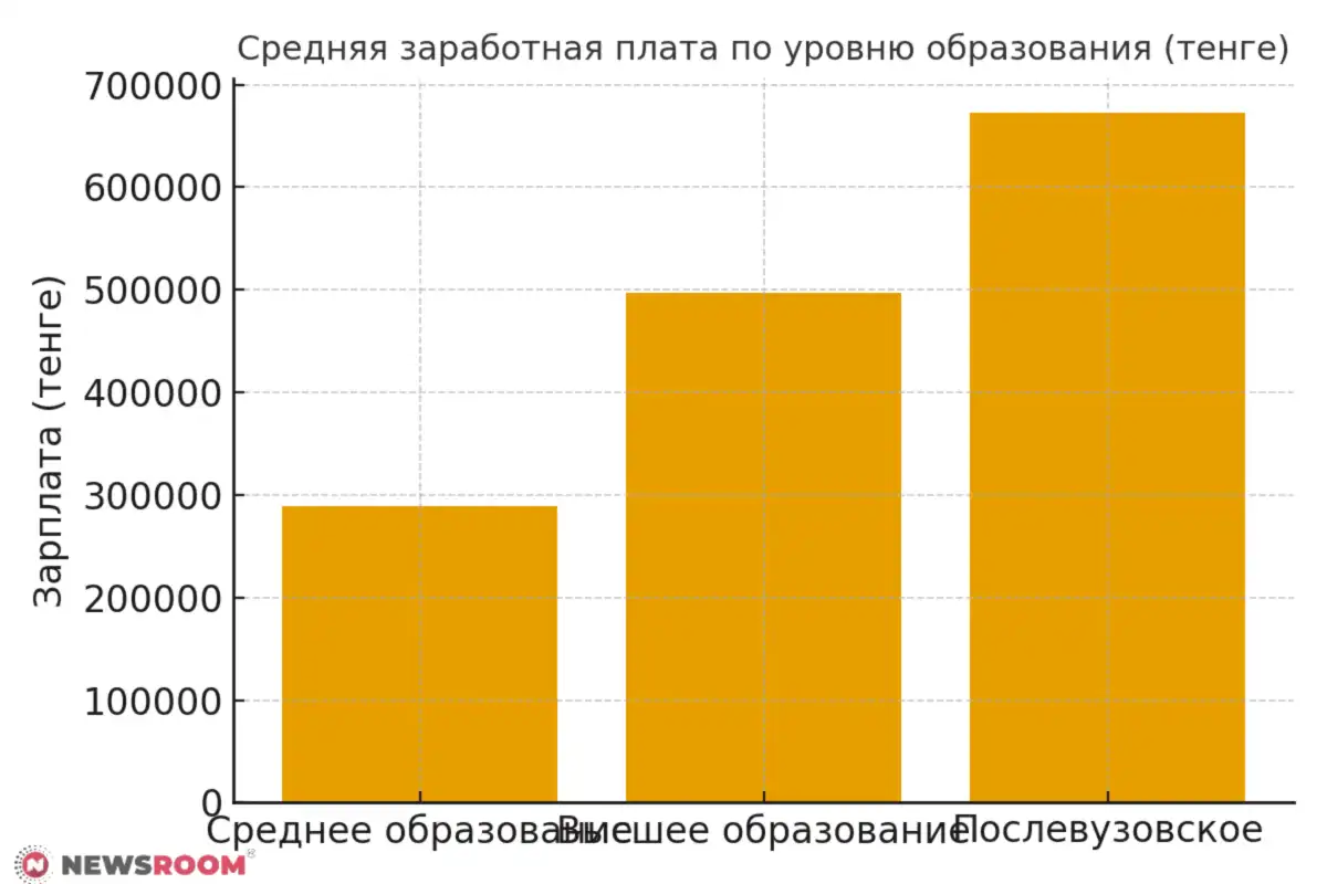 По уровню образования: со средним — 289 673 тг, с высшим — 497 563 тг, с послевузовским — 672 493 тг.