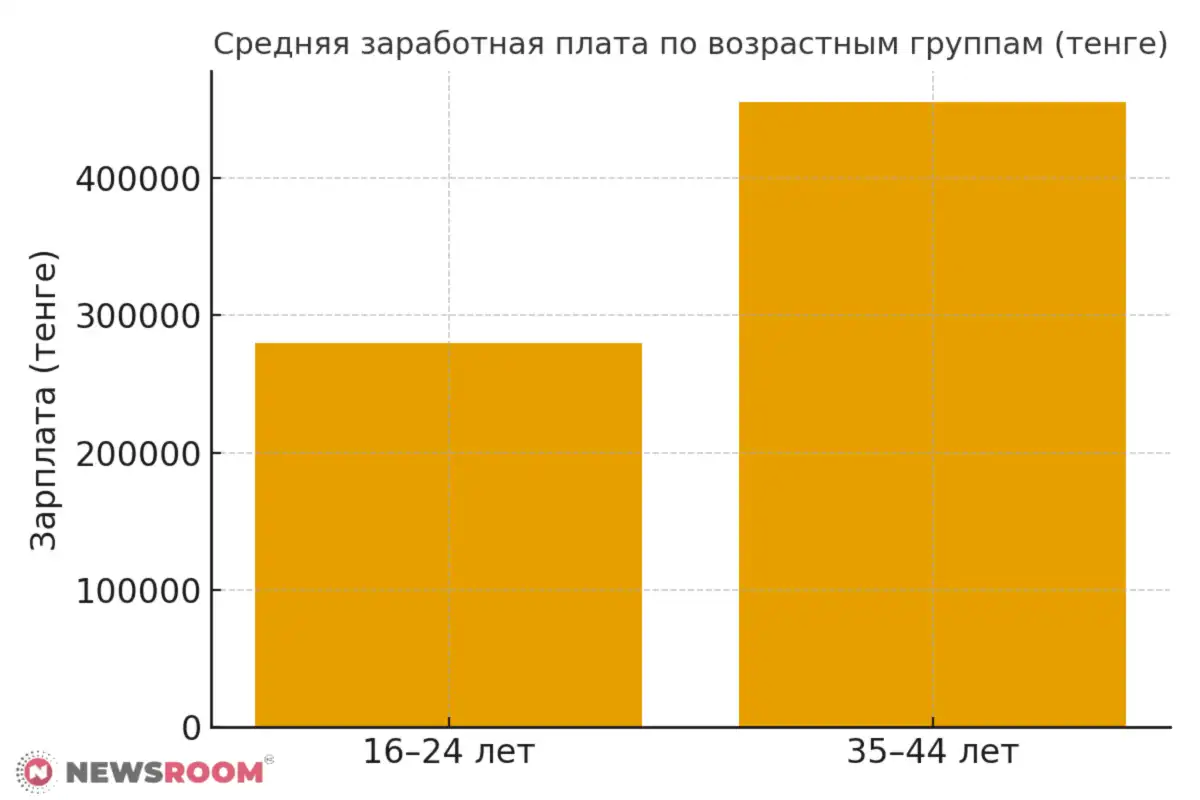 Наибольшая средняя месячная зарплата у работников 35–44 лет (455 070 тенге). Молодежь 16–24 лет получает в среднем 279 875 тенге.