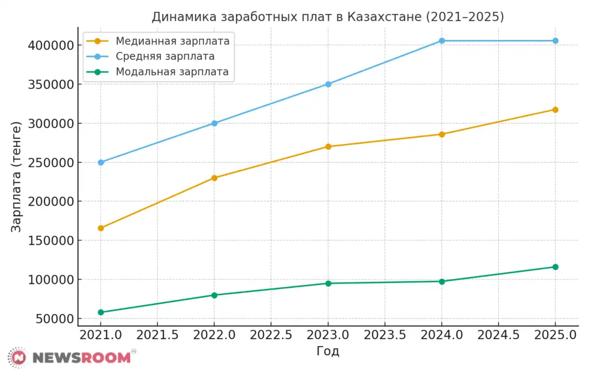 Согласно данным Бюро национальной статистики, медианная заработная плата в Казахстане в 2025 году достигла 317 512 тенге, что на 11,1% выше, чем в 2024 году (в реальном выражении — +0,4%).
