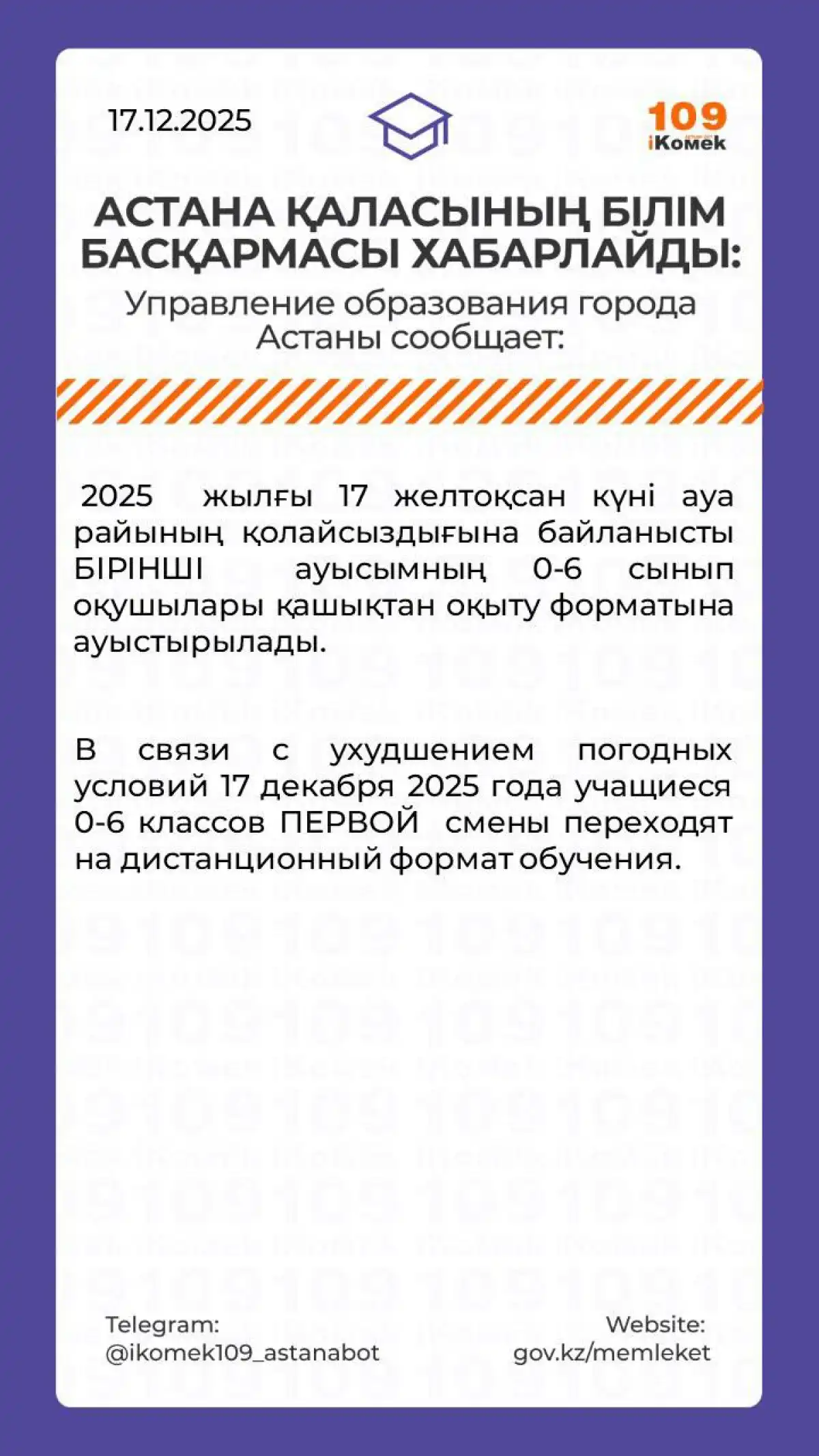 Непогода может осложнить дорожную обстановку и создать опасность для пешеходов. В связи с этим учащиеся 0–6 классов первой смены переведены на дистанционный формат обучения.